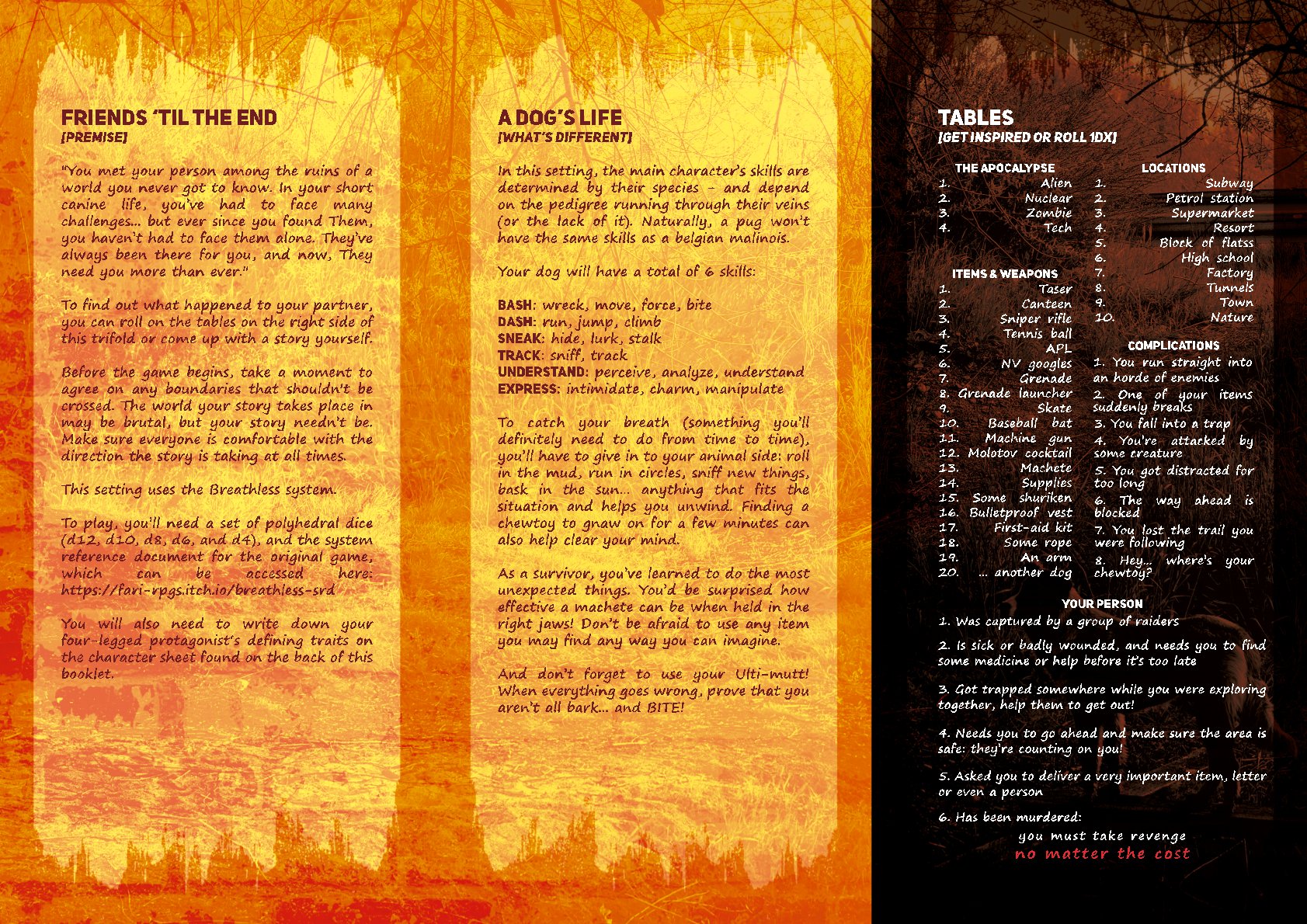 “Lost and hound” es un escenario para Breathless diseñado para dos personas en el que una de ellas interpretará al valiente can que tratará de salvar a su persona favorita. Para jugar necesitaréis un juego de dados poliédricos de 12, 10, 8, 6 y 4 caras, y tener a mano el documento de referencia del juego original (este se encuentra disponible en español en https://el-refugio-editorial.itch.io/breathless-srd-es)